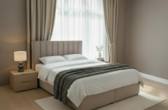Łóżko ze skrzynią na pościel na podnośnikach gazowych.
