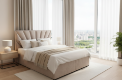 Łóżko ze skrzynią na pościel na podnośnikach gazowych.